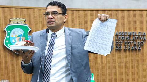 O deputado estadual Sargento Reginauro (União) levou um bolo para a tribuna da Assembleia Legislativa do Ceará (Alece) como protesto pelos 17 anos de promulgação da lei 14.113/2008, que trata — entre outros assuntos — sobre o regime de trabalho semanal dos policiais e bombeiros militares do Ceará.
