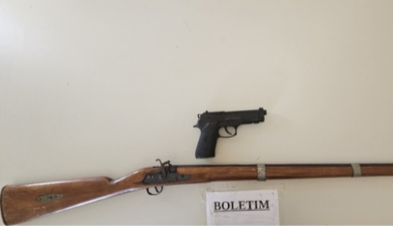 Segundo informações policiais, ciente da situação, os policiais se deslocaram até o local. Após a chegada, a guarnição abordou o proprietário do bar, que confessou possuir uma espingarda de fabricação artesanal e um simulacro de pistola.